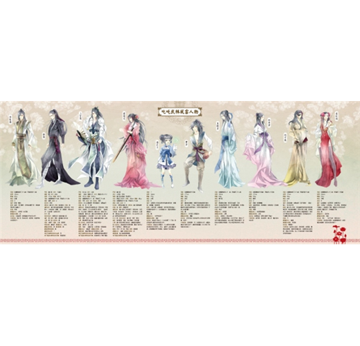 而上官小透同學最初的設定就是一個愛穿白衣的花花公子,但我覺得僅僅如此不夠讓他的形象變得鮮明,於是為他加了很多特殊的設計,例如頭上的孔雀翎,眼下的泣血紋身、昭君出塞的造型、跟隨在身後的彪形大漢、貴公子定律,還有兒時的一些彪悍經歷等等。剛有了這些構思,也立刻打電話給我的死黨野野說了自己的構思,野野沉默了很久說道:「妳已經走火入魔了。我的乖,現在是半夜三點啊!」