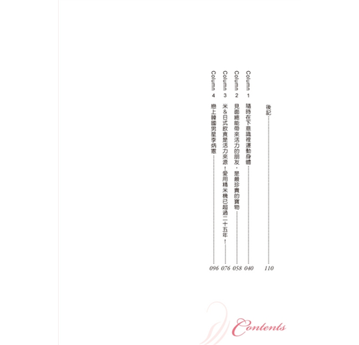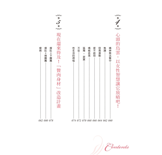 藉由本書,我想向各位傳達的是,女性不論長到幾歲,還是可以讓自己變美,而也只有自己,才能給自己的身體施展美麗的魔法,為此我整理出了這一冊,將所有技巧網羅在書中。
