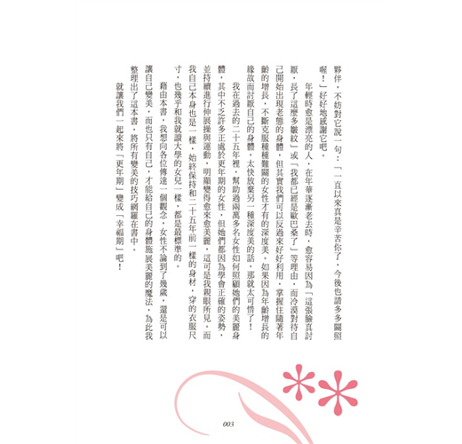 我認為,身體出現了一點狀況,其實並不完全是件壞事;因為那將可以促使我們去思考,如何去改變長久以來忽略的生活壞習慣,變得積極地去面對生活。以這個角度來看,「更年期」所帶來的變化,其實是項可貴的贈禮!能夠將我在每天生活當中親身實踐的方法,以及從中所得到的生活樂趣,分享給全世界的女性,是我一直很想做的事,因此,我非常感謝能獲得此次在鄰近的台灣出版的機會。