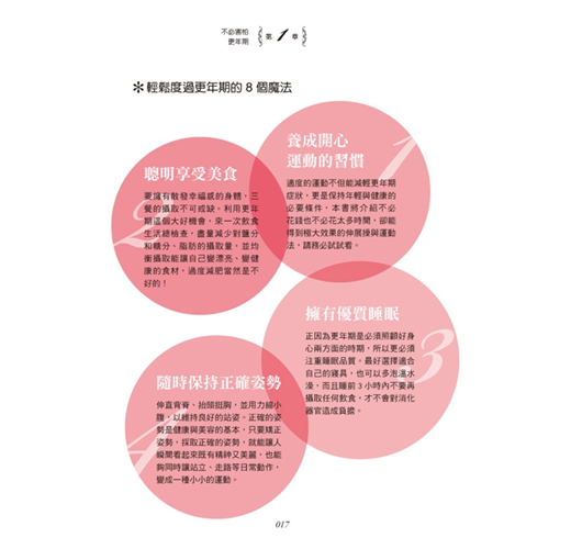 以往為了家人奉獻一切的人,或是為了工作全心投入的人,應該很少有機會認真地面對自己的身體吧?由於更年期會出現各種身心方面的症狀,所以正好給了我們一個機會,讓我們稍微停下腳步來好好照顧自己。