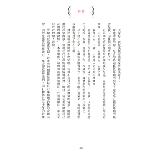 我所指導的對象並不只有年輕女性,不論男女或是各種年齡層的諮詢,我都接受;而從友人或是從學生們的傾訴中,我常會聽到他們對於「更年期」各種症狀感到煩惱的心聲。我自己也經歷了更年期,所以更能體會到──「身體產生變化的時期,更是幫助身體找回『美麗』與『元氣』的好機會!」因此,從我的個人哲學出發,針對更年期,我開發出一套嶄新的方法,並集結成本書出版。