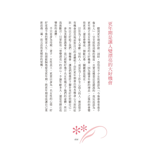 聽到更年期或停經一詞時,恐怕有不少女性都認為「今後會愈來愈不像女人」,完全採取消極的態度。其實這種想法是錯誤的,我反而認為,更年期才是女性變漂亮的大好機會。因為隨著年齡的增長,之後的妳會變得更美,還是會變成一個歐巴桑,關鍵就是現在。