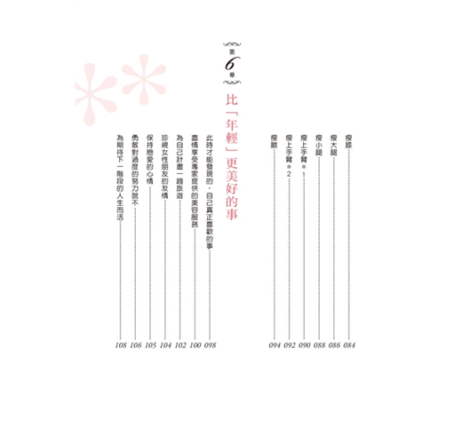 年輕時愈是漂亮的人,在年華逐漸老去時,愈容易因為「這張臉真討厭,長了這麼多皺紋」或「我都已經是歐巴桑了」等理由,而冷漠對待自己開始出現老態的身體,但其實我們可以反過來好好利用,掌握住隨著年齡的增長,不斷克服種種難關而來的女性才有的深度美。如果因為年齡增長的緣故而討厭自己的身體,太快放棄另一種深度美的話,那就太可惜了!