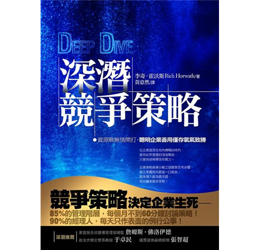 這本《深潛競爭策略》,提供了許多企業主和經理人思考的角度。書中提到這些數字:85%的管理階層,每個月用不到一小時進行策略討論;90%的經理人,每天只作表面的例行公事。我相信很多領導人看到這些數字會很驚訝,但是仔細檢視每個人的工作內容,不難發現這不僅發生在小公司,甚至許多上市櫃公司也難免流於形式的維持營運工作,甚少發揮洞見、直指核心去分析公司的策略。誠如書中以潛水為例,只有那些手無輔助器具,立志潛入極深海域的優秀經理人,時時刻刻追尋與改變企業的洞見,願意冒險也不錯失絕佳機會的態度,才能讓企業絕處逢生,再創企業高峰。