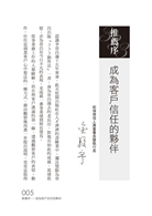 非常喜悅此書的問市。這是一本利用淺顯易懂的文字,實例說明步驟並逐一引導,讓有心想從事此行業的人士,做為參考借鏡的工具書,亦讓管理職從書中,調整修煉進而可以輔導組員,讓組員的業績能更上一層樓,若不是壽險從業人員,亦可從此書中獲得行銷的樂趣及飽覽行銷的菁華。