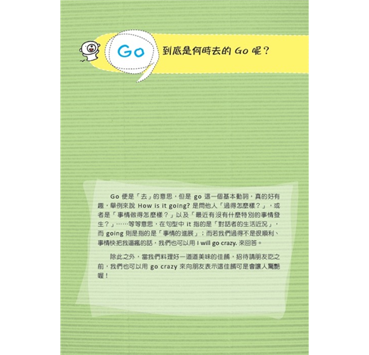 所以,我們在日常生活中,找出兩個基本單字搭配而成,就可以抵上一連串的冗長的英文句型,很神奇吧?讀者可要好好體會其中英文對話的「眉角」呢。