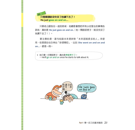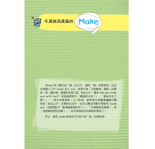 2.閱讀完此書,讓我因為英文而煩悶的心鬆了一大口氣,只要一想到文中的俗語,馬上就能聯想起 get、have完整意義以及作法,就像有位朋友在身旁親切的教導我英文,自然而然開口練習起來,真的很感謝作者的用心!(金宇先,36歲,語言教育者)