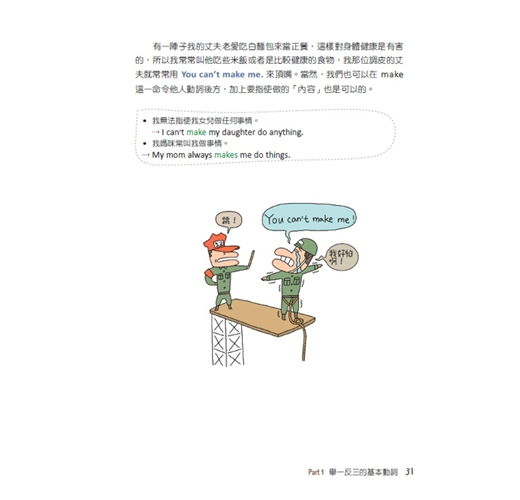 我想這句話大家一定都很熟悉吧?小時候常被爸媽指使「不要玩啦,快去做功課」、「不要吃零食啦,吃正餐!」……等等,要反抗時,就是:You can’t make me!。舉完這個例子,大家應該都記住了這句了吧?有一陣子我的丈夫老愛吃白麵包來當正餐,這樣對身體健康是有害的,所以我常常叫他吃些米飯或者是比較健康的食物,我那位調皮的丈夫就常常用 You can’t make me. 來頂嘴。當然,我們也可以在 make 這一命令他人動詞後方,加上要指使做的「內容」也是可以的。