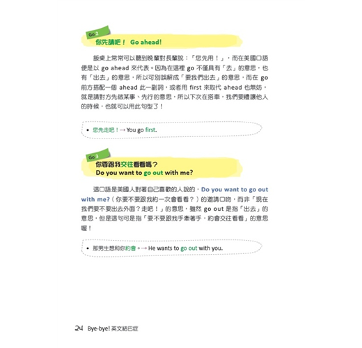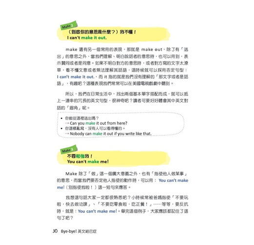 這也就是我在《Bye-bye! 英文恐慌症》,針對學習英文的初學者,指導在美國如何生存的學習方針。而這一本書《Bye-bye! 英文結巴症》,更針對學習「英文口說」的初學者,告訴他們英文口說第一步應該如何進行的學習指南。所有的英文都有其基本的句型以及架構,若我們能抓住其基本骨架,才能更進一步正確使用更複雜、艱深的英文詞彙。