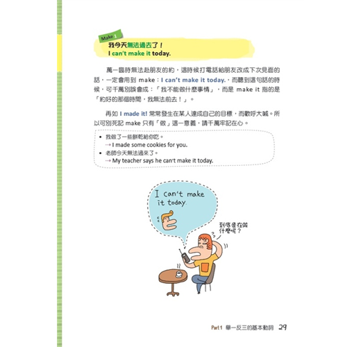 萬一臨時無法赴朋友的約,這時候打電話給朋友改成下次見面的話,一定會用到 make:I can’t make it today.,而聽到這句話的時候,可千萬別誤會成:「我不能做什麼事情」,而是 make it 指的是「約好的那個時間,我無法前去!」。