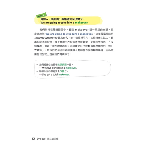 我們常常在電視節目中,看到 makeover 這一單詞的出現,但是此用詞 We are going to give him a makeover.,以美國電視節目Extreme Makeover 最為有名,把一個長相平凡、衣服樸素的路人,藉由設計師的設計,換上華麗的衣服或者是新髮型,來加以大改造,「改頭換面」重新出現在觀眾面前。而這種節目也就類似我們國內的「週日大精彩」。所以我們可別以為和美國人對話當作很困難的事情,因為常用的句型就出現在我們電視中了!