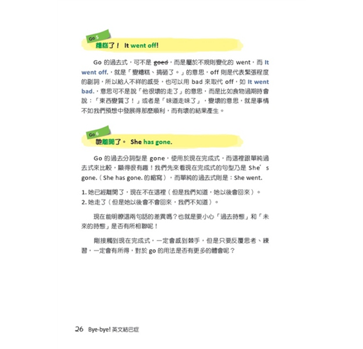 Go 的過去分詞型是 gone,使用於現在完成式,而這裡跟單純過去式來比較,顯得很有趣!我們先來看現在完成式的句型乃是 She’s gone.(She has gone. 的縮寫),而單純的過去式則是:She went. 1. 她已經離開了,現在不在這裡(但是我們知道,她以後會回來)。2. 她走了(但是她以後會不會回來,我們不知道)。