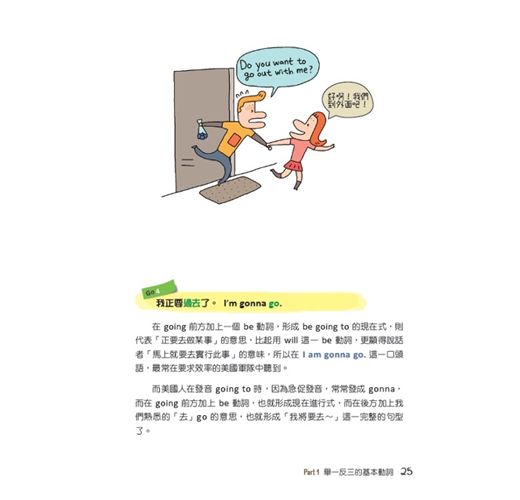 而美國人在發音 going to 時,因為急促發音,常常發成 gonna,而在 going 前方加上 be 動詞,也就形成現在進行式,而在後方加上我們熟悉的「去」go 的意思,也就形成「我將要去∼」這一完整的句型了。