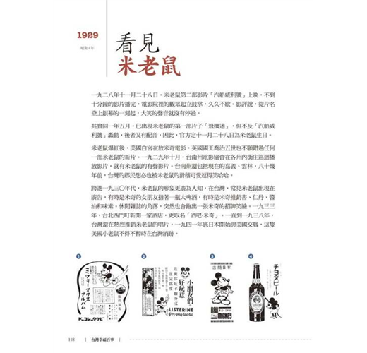 還有卡通明星米老鼠,已經陪伴好幾代人成長。一九二九年,米老鼠還不到兩歲,台灣人就認識牠了。曾經有一張一九三五年台灣博覽會會場的鳥瞰繪圖,也有米老鼠的蹤影,似乎博覽會場裡,曾有米老鼠的大型造物。