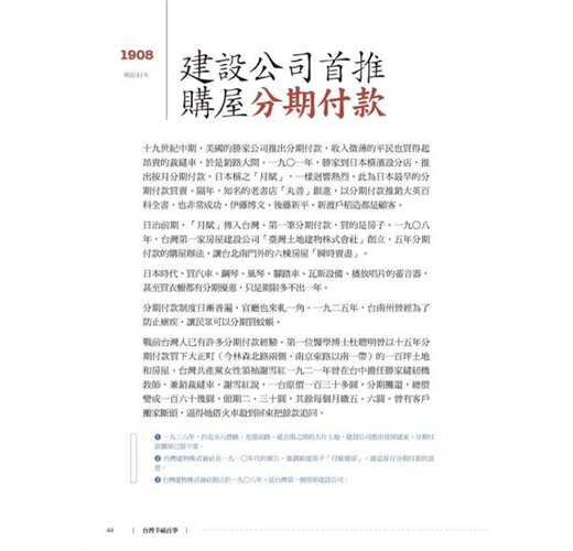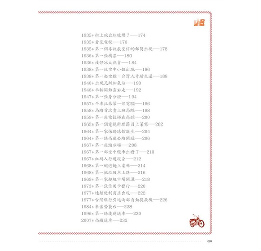 熟悉史學的人大概要笑,這是哪門子的夢想。台灣史大事記伸手可得,隨便抄抄就有。不過,我夢想做得出來的大事記,不是那些已經被知道的政經大事,而是像歷史秘密一樣,還未被發現的那些東西。譬如,我們天天在走的斑馬線,何時開始出來保護行人的?街上亮著五顏六彩的霓虹燈,幫我們以小錢買到高價商品的分期付款,何時為我們的生活添加繽紛色彩的?許許多多類似的現代生活事物的來台起源,尚未被揭曉。到底它們都是在甚麼時候、以甚麼方式,鑲嵌進台灣的世界,構築出一幅充滿活力的現代畫?