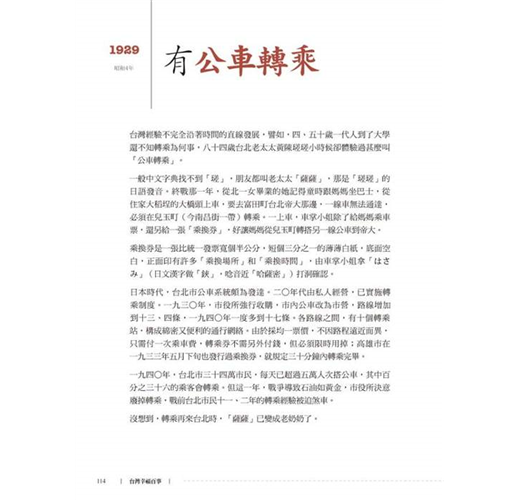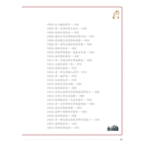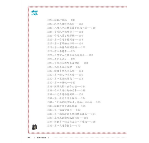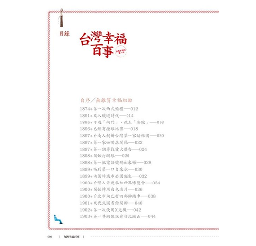 因為餐桌上米價曆的啟發,一百則台灣的第一次,是以編年的方式綴成。希望讀者翻書如看連續劇,一集一事物,平均一集四、五百字;以時間為軸,連續讀下去,就能看見現代化新事物在台灣的第一次演出,也可以感覺到悠悠時光在這塊土地的連續流動,而不是被切斷的,台灣有自己的百年生活記憶曲線。事實上,如果台灣社會的物質文明發展程度可以畫成曲線,二○到三○年代,就有一段高坡,不失為一個豐富的年代,之後隨戰爭而滑落,戰後初期則低迷待甦,慢慢才再向上攀升。