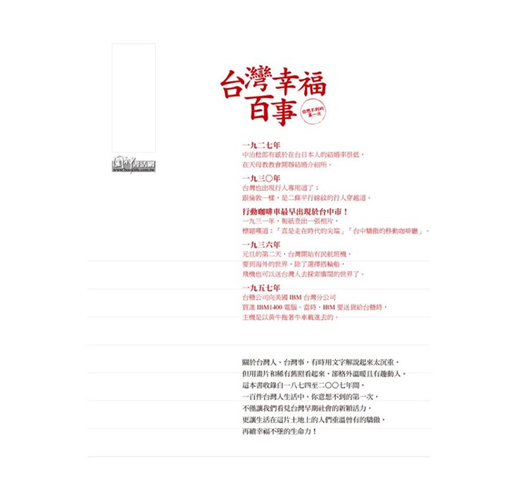 關於台灣人、台灣事,有時用文字解說起來太沉重,但用畫片和稀有舊照看起來卻格外溫暖且有趣動人。這本書收錄自一八七四至二○○七年間,一百件台灣人生活中、你意想不到的第一次,不僅讓我們看見台灣早期社會的新穎活力,更讓生活在這片土地上的人們重溫曾有的驕傲,再續幸福不墜的生命力!
