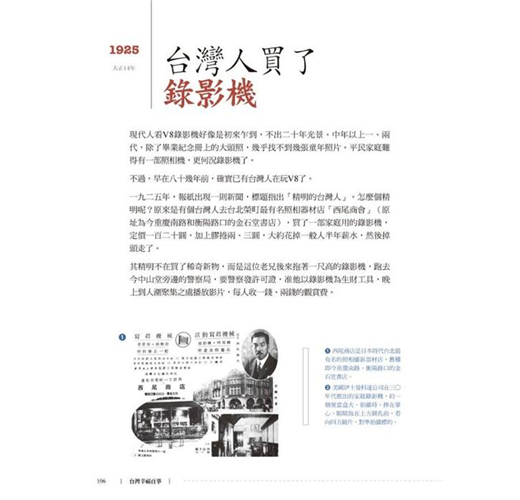 這本書記錄了一百項台灣人生活的第一次,超過六十個是我近幾年挖掘的題目,其中,像是第一台電冰箱、第一部摩托車、第一次的母親節和開始轉用白色名片等等約有二十個,已散見之前的幾本著作。其他近四十則,則是一年多來的全新發現。