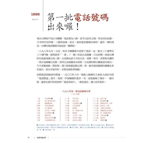 1898第一批電話號碼出來囉!現在台灣家戶或公司機關,電話都為八碼,更早以前有五碼,時光再往前推,日本時代有四碼、三碼和兩碼,甚至,最初電話號碼出現時,還有一碼的情況。台灣的電話號碼可說是從一號開始。一八九八年九月,台北一些官方機構集中設置了電話,這一批共三十個單位三十個門號,搶得頭香「一番」(一號)的是台北縣廳。日治初期,西部台灣的行政區域僅分成三縣,台北縣包括今天的台北、基隆,新竹、苗栗和宜蘭的一部分也歸屬台北縣。當時台北城牆尚未拆除,台北縣的辦公廳就設在城內,今天重慶南路、開封街、漢口街和館前...