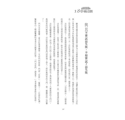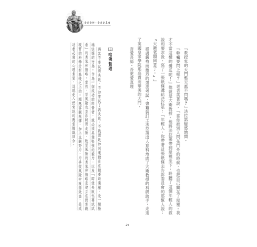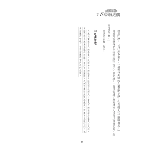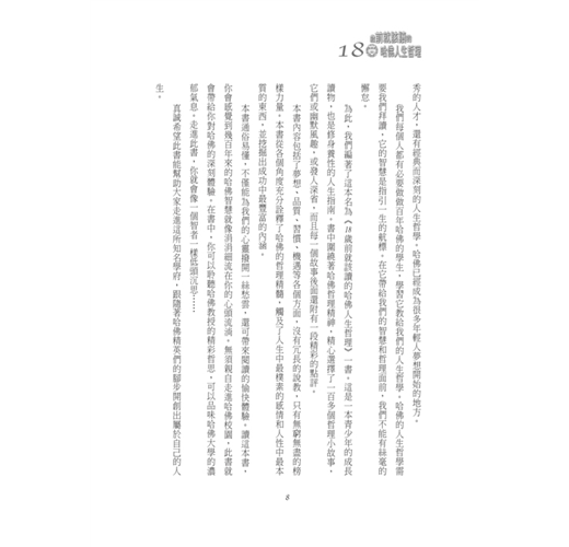 為此,我們編著了這本名為《18歲前就該讀的哈佛人生哲理》一書。這是一本青少年的成長讀物,也是修身養性的人生指南。書中圍繞著哈佛哲理精神,精心選擇了一百多個哲理小故事,它們或幽默風趣,或發人深省,而且每一個故事後面還附有一段精彩的點評。