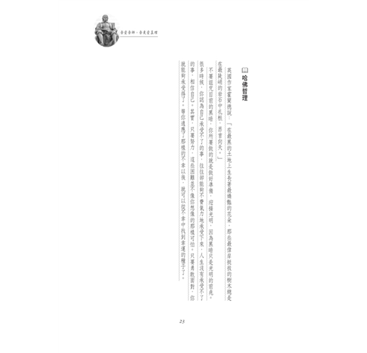 本書通俗易懂,不僅能為我們的心靈撥開一絲愁雲,還可帶來閱讀的愉快體驗。讀這本書,你會感覺到幾百年來的哈佛智慧就像涓涓細流在你的心頭流淌。無須親自走進哈佛校園,此書就會帶給你對哈佛的深刻體驗。在書中,你可以聆聽哈佛教授的精彩哲思,可以品味哈佛大學的濃郁氣息。走進此書,你就會像一個智者一樣低頭沉思……