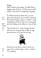 仔細觀察這本書的編排,發現這本書能成為女兒第一本完整讀完的雙語書並非偶然,故事情節引人入勝當然是主因,但編輯設計的用心,也讓讀者的閱讀過程更加順暢:仿手寫的英文字體吸引女兒從英文開始閱讀,書中的漫畫和書頁旁的單字註解幫助她大部分的時間都能順暢的往下看,實在不懂的地方,也可以輕易找到中文版標示的同一書頁,解決心中的疑問之後再翻回英文版繼續看,而中文版的翻譯,除了細心做了文化知識的註解,許多難以翻譯的文字遊戲也費心加以轉換,讓女兒讀完英文後,為了比較中文版和英文版哪一個比較好笑,還能興致勃勃地把中文版也從頭看了一遍。