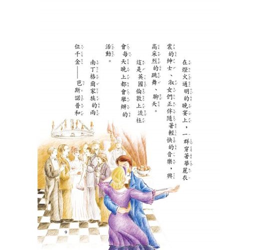 在燈火通明的晚宴上,穿著華麗衣裳的紳士、淑女們,伴隨著輕快的音樂,興高采烈的跳舞、聊天、嬉鬧著。
