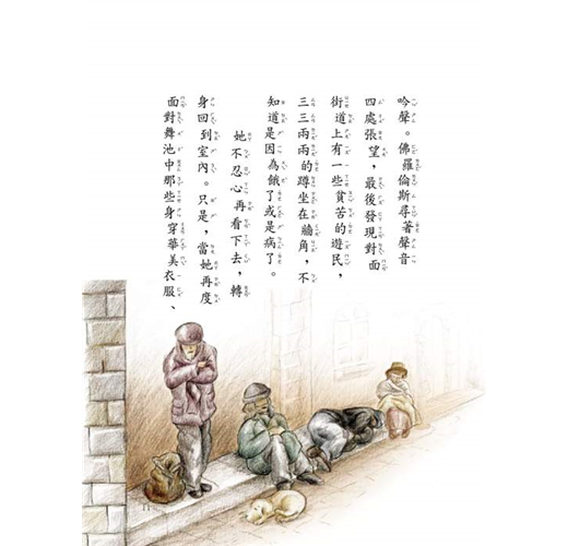 忽然,耳邊傳來一陣陣痛苦的呻吟聲。她尋著聲音四處張望,最後發現對面街道上有貧苦的遊民,三三兩兩的蹲坐在牆角,不知道是因為餓了或是病了。