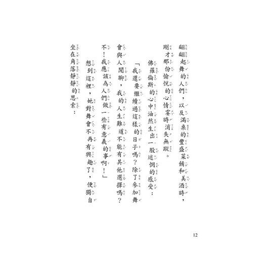 不忍心再看下去,她轉身回到室內。只是,當她再度面對舞池中那些身穿華美衣服、翩翩起舞的人們,以及滿桌的豐盛菜餚和美酒時,剛才愉悅的心情霎時消失無蹤。