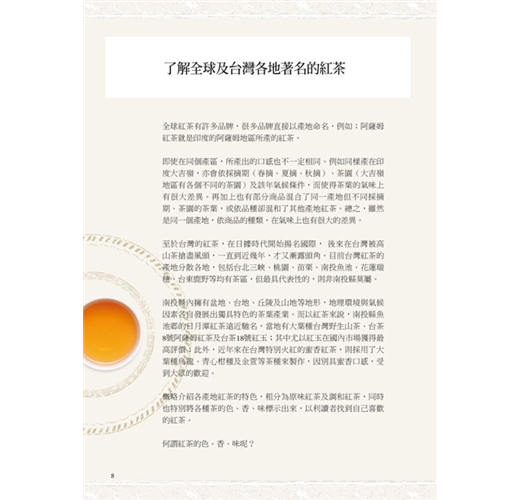 大吉嶺、阿薩姆、祁門、紅玉、伯爵、春摘茶、秋摘茶,這麼多種類的紅茶式怎麼分類的?哪些茶適合純飲?哪些紅茶又適合製作奶茶? ……快翻到P.6的〈認識紅茶家族〉。