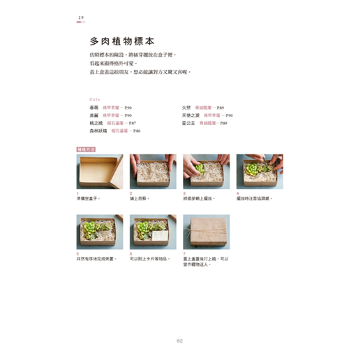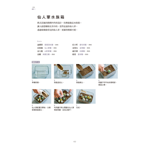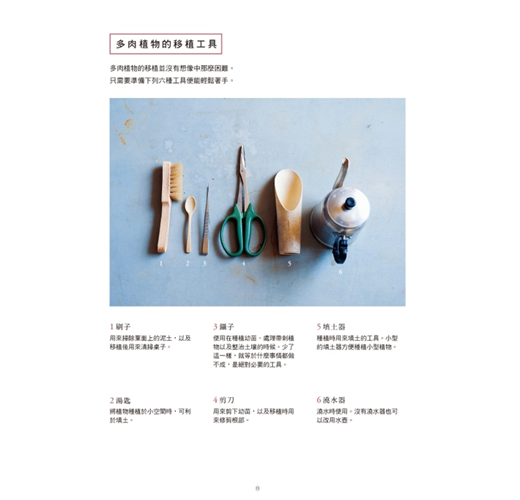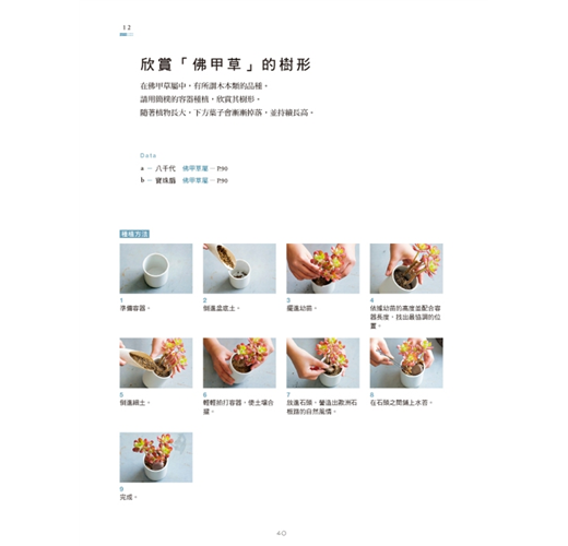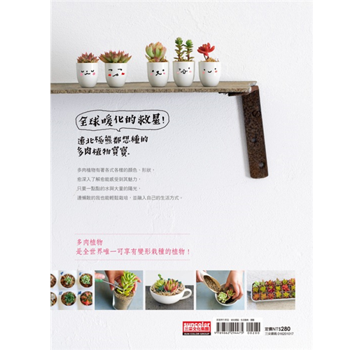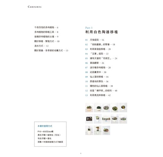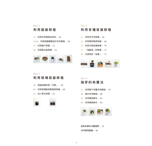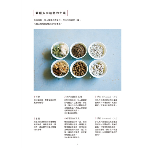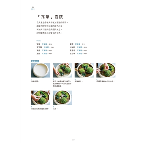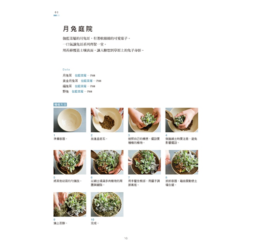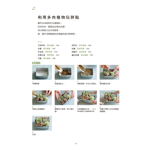 書中敎你透過不同的方式去移植,讓多肉植物跳脫以往種花的傳統,再搭配上各種不一樣的盆器,讓多肉植物的特色與質感更加突顯。誰說多肉植物只能種在盆子裏,它也可搭配各式不同的盆器,呈現不同的感覺,讓整體的質感大大提升!