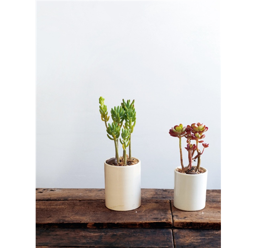 利用白色陶器與布丁杯所設計的迷你盆栽大受好評。