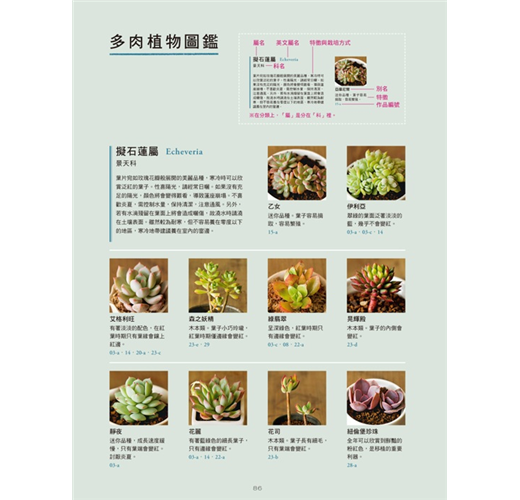 ★你更不能錯過書中內附的多肉植物圖鑑,依照不同屬別,分類介紹不同品種,讓初學者對各種品種的特色與習性,更加容易掌握,也是拿著去花市尋寶的好秘笈。