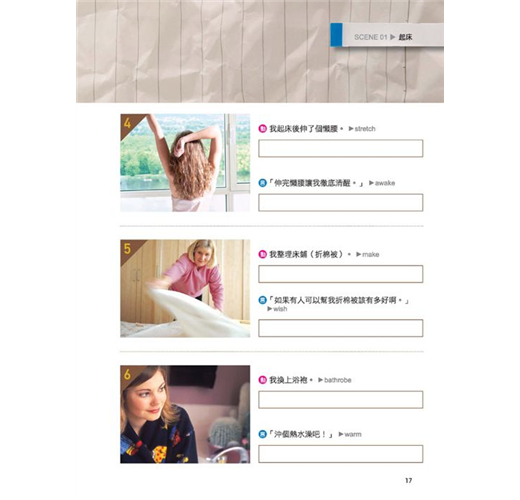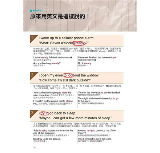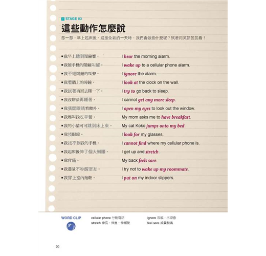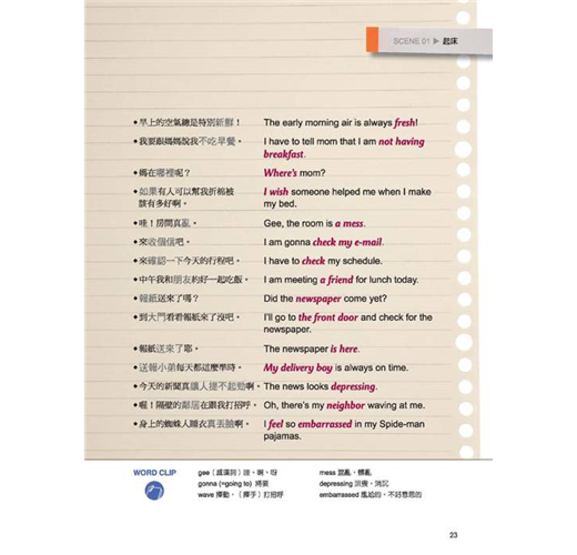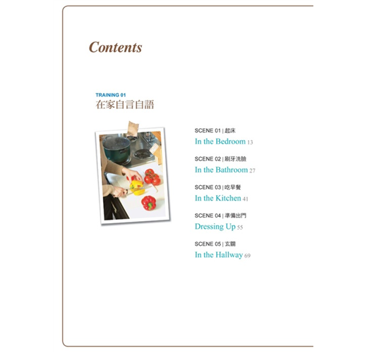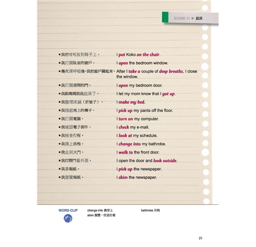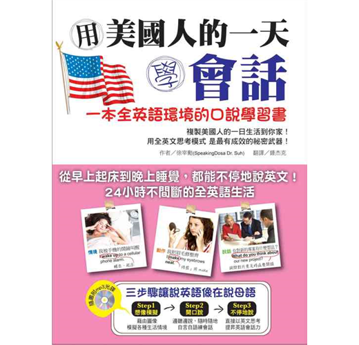 美國人的一天,跟我們並沒有什麼不同。只是他們都是在「英文模式」下進行的。這本書就是要幫你「複製」美國人的英文生活模式,讓你24小時都要用英文想、用英文說,連作夢都要用英文,每天一張開眼睛,說著 ”What! Seven o’clock already?”(什麼!已經七點了?);每天上床睡覺前,想著 ”I am getting sleepy…”(我漸漸覺得睏了…)。從早到晚,自己打造出這樣一個全英語環境,每天都像美國人一樣過生活,用英文思考、用英文跟自己說話,把英文融入生活,會話能力當然會突飛猛進!