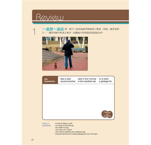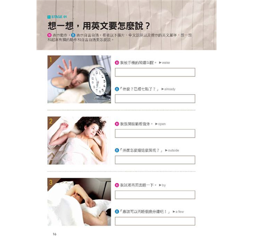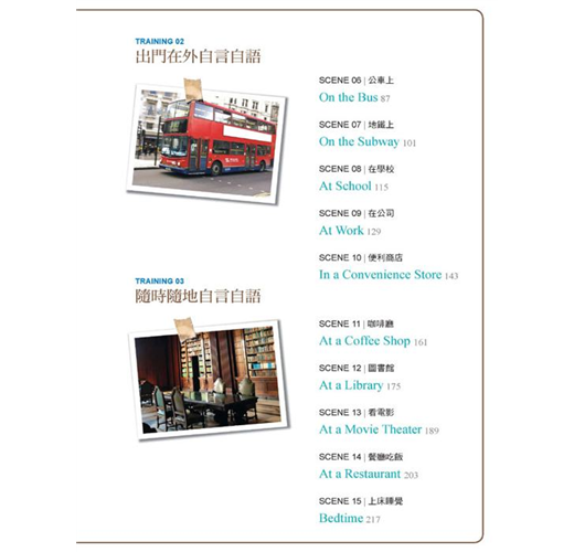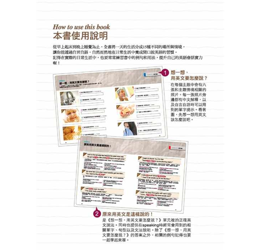 3. 圖像引導開口說!模擬各種生活情境,隨時隨地都能練英文。本書包括15種不同情境,網羅了從簡單到稍微有一點難度的各種例句,在每個單元裡都提供了包括來自美國、英國、加拿大等英語系國家的實境照片,幫助你模擬想像各種生活情境,看著照片旁邊的中文解釋以及可利用到的單字,讓你能夠更輕鬆地透過「跟自己說」來練習英語會話。除此之外,在解說的部分更跳脫了制式的翻譯方式,而是以最口語的會話方式來做說明,讓你在閱讀本書時,就像在跟朋友聊天一樣輕鬆。