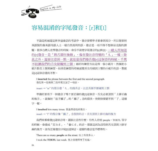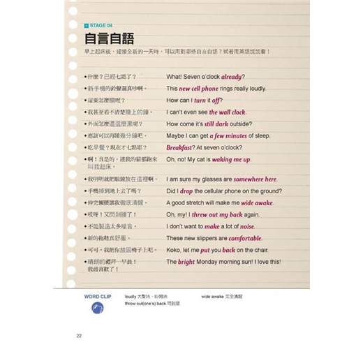 4. 附英語母語人士錄製MP3,讓你從早上起床到晚上睡覺都能不停地說。有了開口說英語的「素材」,你還需要留意說英語時的發音與語調。因為發音若不正確,像是習慣把 ”John” 唸成「醬」、”Queen” 唸成「昆」、”Cancel” 唸成 “Cancer”,這些錯誤的發音會讓外國人感到一頭霧水。書中附贈MP3,其中的英文句子皆邀請以英語為母語的專業配音員錄製。請先聽一遍MP3中的對話,熟悉外國人的正確語調和發音,再對照書上的句子跟著一起唸;一定要模仿外國人的音調,才能說出正確又漂亮的英語發音!