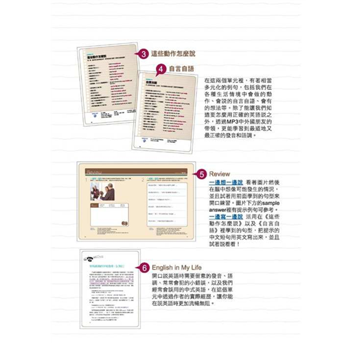 模擬各種生活情境! 如同置身在美國的實境會話 1. 開始「找自己」用英文聊天!「我」,就是最好的英語會話拍檔!遇到外國人,常常都緊張得說不出話來嗎?這是因為你擔心自己的發音和文法以及缺乏自信心的緣故。的確,很多人都是只為了「考試」與「成績」學英文,而忽略了學英文最重要的就是要說出口、能與外國人溝通。這本書要教給你的不是考試解題的技巧,而是能讓各位能真正開口說英文的方法。「跟自己用英語對話」對提升英文能力非常有幫助,不需要有英語很好的人來跟你對答,也不需要另外抽出時間,不知道單字或句型怎麼說時,還可以馬上看書;最重要的是,既然是自己跟自己說話,說錯了也不怕丟臉!