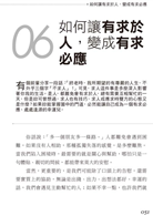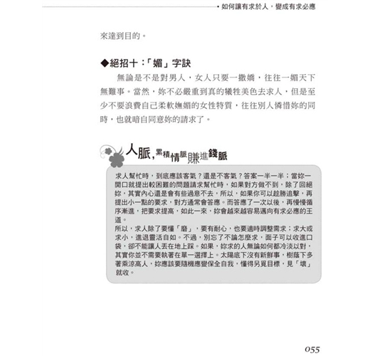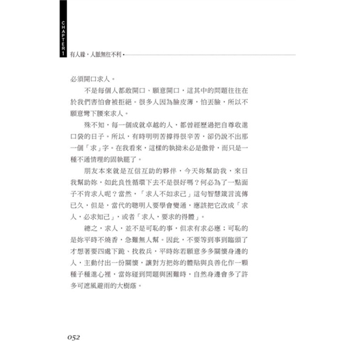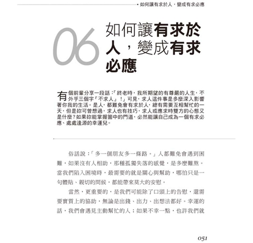 有個前輩分享一段話:「終老時我所期望的有尊嚴人生,不外乎三個字『不求人』!」可見,求人這件事是多麼深入影響著妳我的生活。是人,都難免會有求於人,總有需要互相幫忙的一天,但是妳可曾想過,求人也有技巧,求人或應求時雙方的心態又是什麼?如果妳能掌握箇中門道,必然能讓自己成為一個有求必應、處處逢源的幸運兒。