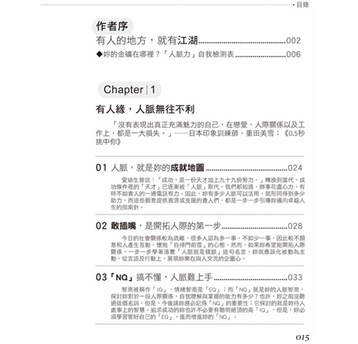 同時,我也期許我自己和書前每一位讀者,都能藉由與他人互動的經驗,更加瞭解自己是個怎麼樣的人,並從中找出再修正並且更提升的方式。畢竟,想成為一個長袖善舞,活用人脈創造利益的人,先決條件她必然是一個懂得自己要什麼、目標何在的人。雖然,很多人都說「江湖險惡,人心不古」,不過既然妳我都做不到離世而居的隱者,那不如認真的在江湖上留下一片好名聲,不是嗎?