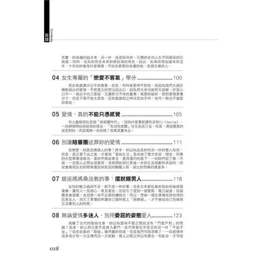 男女相處講求公平與尊重,但是,有時候愛得不對勁,是因為我們太過於矯飾彼此的愛情,不把真正的想法說出口,因為想太多怕被對方誤解,於是心口不一,做出令自己委屈,又讓對方不快的蠢事。親愛的姐妹,面對愛情要懂分寸,但是千萬不能太客氣,否則當緣份之神決定收手時,祂可一點也不會跟妳客氣。