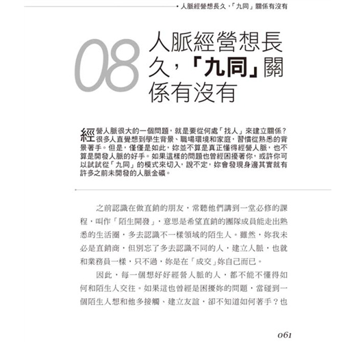 經營人脈很大的一個問題,就是要從何處「找人」來建立關係?很多人直覺的想到學生背景、職場環境和家庭,習慣從熟悉的背景著手。但是,僅僅如此,妳並不算是真正懂得經營人脈,也不算是開發人脈的好手。如果這樣的問題也曾經困擾著妳,或許妳可以試試從「九同」的模式來切入,說不定,妳會發現身邊其實就有許多之前未開發的人脈金礦。