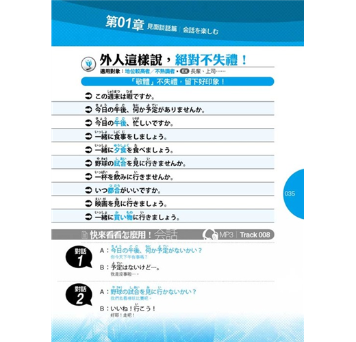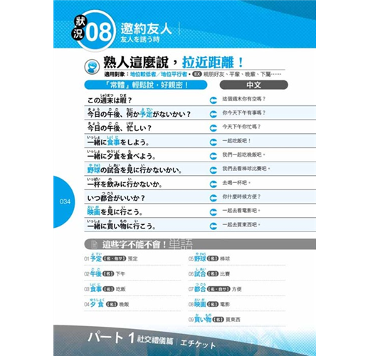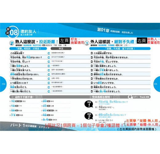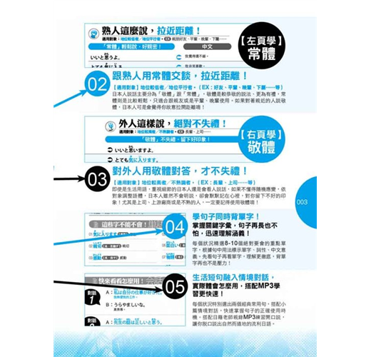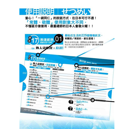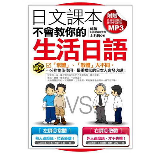 這本《日文課本不會教你的生活日語》便是以這樣的理念為出發點。不同於坊間一般著重於單字詞彙量的日語工具書,本書的編輯理念點出了日語文化與其他語言的不同之處-敬體文化。相較於其他語言,日語是一個較為複雜而繁瑣的語言體系,日本人對於禮儀方面十分注重,即使只是一般生活對話,還是會依據談話對象、場合、情況的改變而有不同的規則。日本人說話主要分為「敬體」跟「常體」,敬體是下對上使用的嚴肅尊敬語,常體則是顛倒,只適合跟親友或是平輩、晚輩使用。如果對著親近的人說敬體,日本人反而會覺得你是不是故意拉開距離。