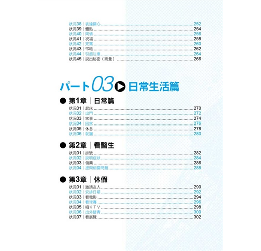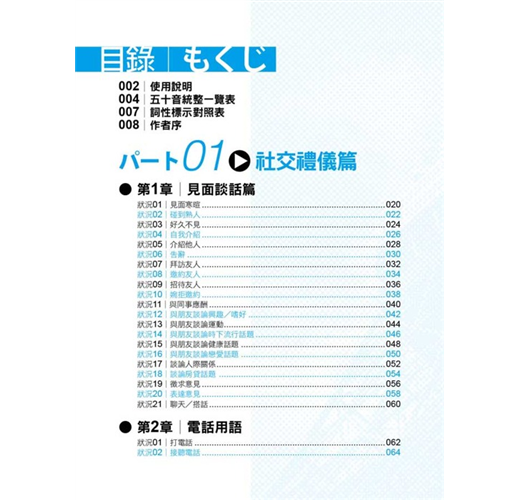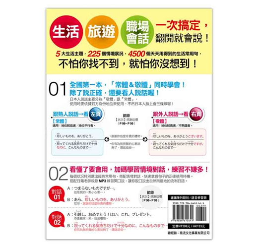 《日文課本不會教你的生活日語》本書匯集了日常生活中最常遇到的情況,並列舉出日本人最常用的回答或短句。一句中文短句搭配上日文敬體和常體的說法,讓讀者能夠一次掌握到日語文化的獨特之處。並且能夠釐清何時應該使用敬體,何時又可以使用常體。
