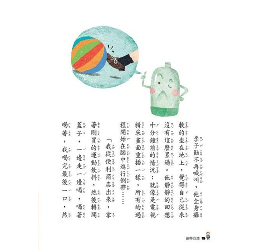 李子勛是一位愛喝飲料的小男孩,每天放學手上一定有瓶飲料。他最喜歡喝完飲料後,把空瓶隨手一拋的丟向垃圾筒,沒有丟進也不在意。一天怪事發生了,李子勛照舊亂丟寶特瓶,不料,瓶口湧出了一股力量,「咻」的一聲,他被寶特瓶吸了進去。