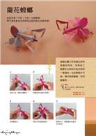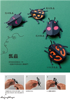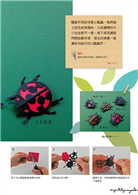 這本新書中的昆蟲剪紙教作示範,比起第一冊更生動活潑了許多。以瓢蟲為例,透過不同色紙的交疊運用,讓一些小昆蟲的外觀呈現更傳神、更微妙唯肖。而四種頭角崢嶸的角蟬,還有知名的蘭花螳螂、魔花螳螂與大小朋友都愛不釋手的長戟大兜蟲、南洋大兜蟲等,無論是牠們奇妙的長相、誇張的肢節、特異的體能……,在大師細膩的創作下,無一不是栩栩如生得讓人拍案叫絕,也再次讓人見識到,作者對大自然中這些小精靈的獨到情感與見解。