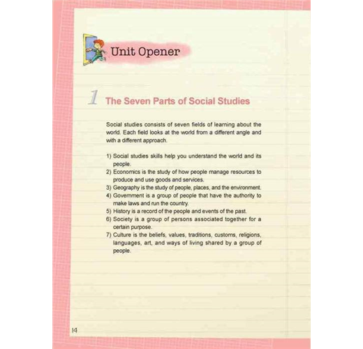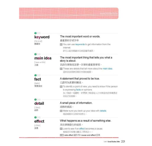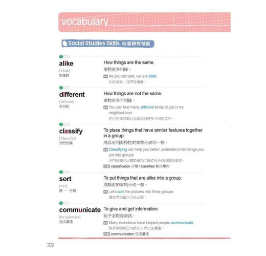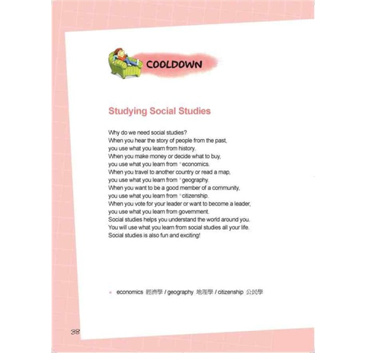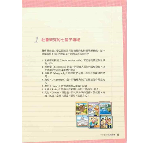 6. 史上首創!涵蓋「自然、人文、歷史、政治、國際情勢、商業貿易…」等都屬於社會科內容!是一般人都應該具備的基礎知識! 除了美國人常用單字最完整收錄,這本書還獨家收錄社會科內容,讓讀者有機會和美國學生一起上社會課!每個單元都有重點提要,獨家搭配中文