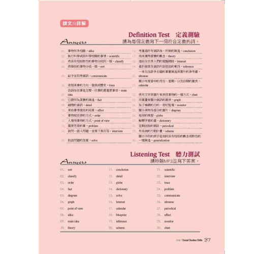 美國學生在課堂上聽課一樣的感受。每個單元還附有定義測驗及聽力測驗,不但能測試讀者對於一個單元的理解程度,亦能測驗自己對於字彙的理