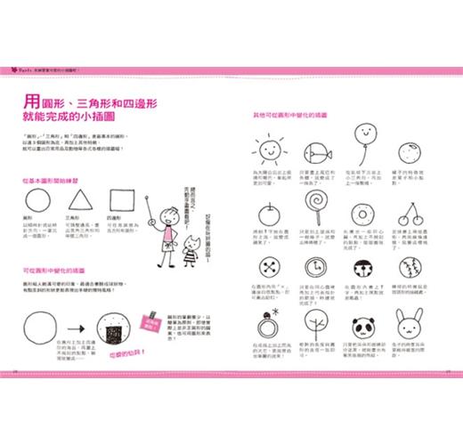 ◎圓形、三角形及四邊形,用最簡單的圖形排列組合,就能變身可愛插圖!