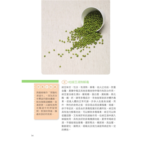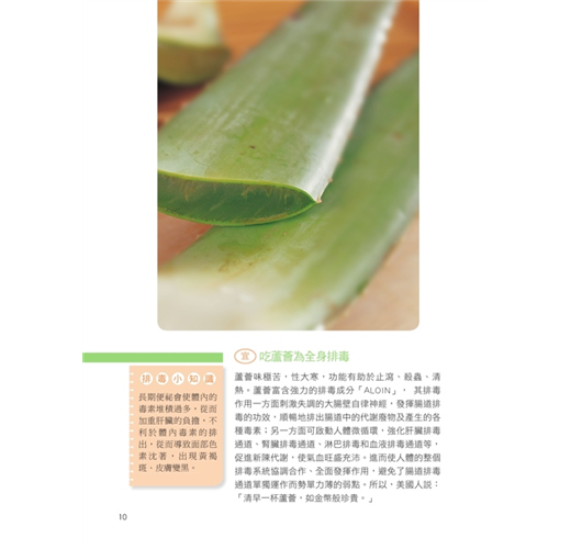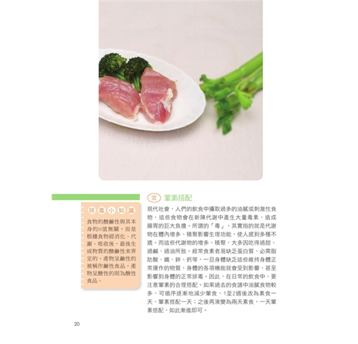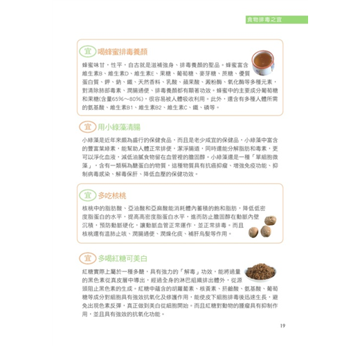 ● 針對食物排毒、水果排毒、飲水排毒、藥療排毒、營養排毒、心理排毒、美容排毒、運動排毒、居家排毒九大方面下手,讓排毒融合在生活中。