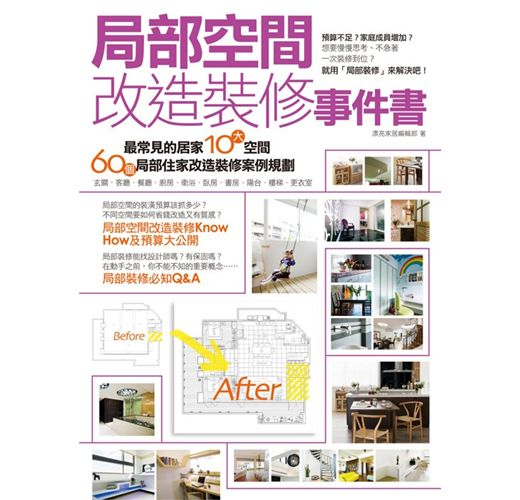 若您有以上問題不用再擔心!透過「局部裝修」概念改造居家,即使時間不夠、預算不足、,也能獲得良好的解決方案。《局部空間改造裝修聖經》一書,以居家不同空間為單位,系統化分類,針對玄關、客廳、餐廳、廚房、衛浴、臥房、更衣室、書房、樓梯、陽台等10大空間為主題,深入介紹解析局部空間的改造重點。